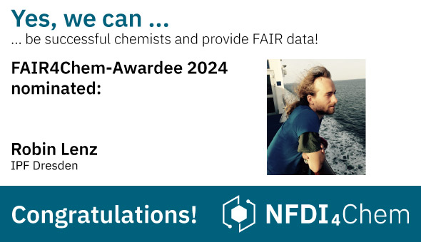 The FAIR4Chem Award aims to encourage chemists to make their research data openly available to the chemical community in accordance with the FAIR principles. Zu diesem Zweck wird der beste Datensatz bzw. werden die besten Datensätze jedes Jahr mit 500 Euro prämiert (finanziert durch den Fonds der chemischen Industrie)