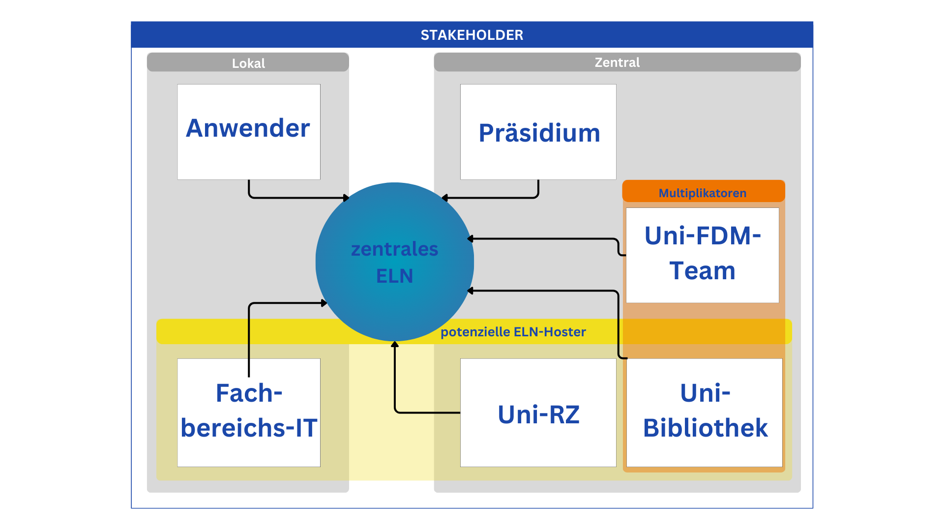 Schatzschneider übernimmt daraufhin die Verantwortung für die Einführung eines ELN an der Fakultät. Zu diesem Zeitpunkt nutzen einzelne Arbeitsgruppen eigene Software. Ein zentrales ELN ist jedoch effizienter, da Admin-Tätigkeiten wie professionelles Hosting, Update- und Benutzerrechte-Verwaltung und Backup auf diese Weise nur einmal anfallen. Hinzu kommt, dass das Rechenzentrum (RZ) der JMU Würzburg die Strategie verfolgt, Dienste grundsätzlich universitätsweit und nicht nur für einzelne Fachbereiche anzubieten. Aus der Idee eines ELN für seinen Arbeitskreis wird ein universitätsweites Projekt. Dies ist durchaus auch im Interesse der Hochschulleitung, weil eine vorhandene ELN-Infrastruktur mittlerweile für Exzellenzanträge oder andere große Verbundprojekte nachgewiesen werden muss.