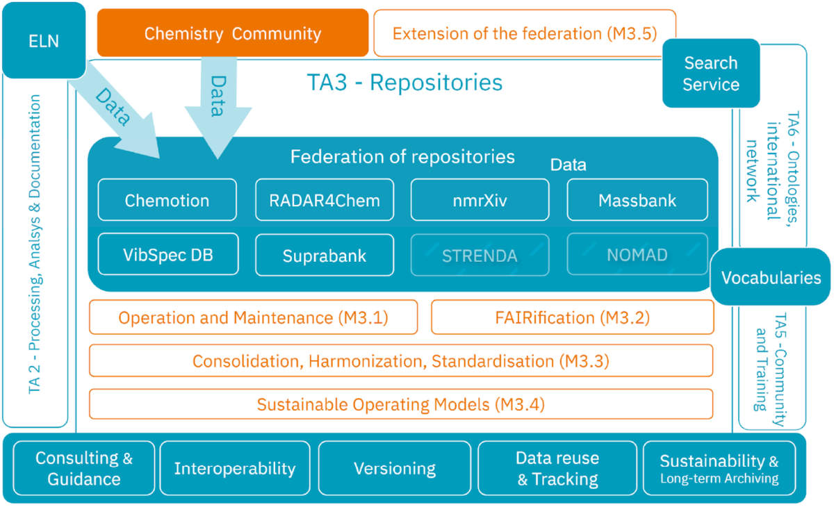 Current work within the infrastructure initiatives focuses on the further development of central chemical research data services and their seamless networking. An important focus is on RADAR4Chem, which has been fully connected to the TS4NFDI terminology service. This makes standardised vocabularies available directly in the metadata editor, including automatic term suggestions and ontology links. Advanced filter options for “keywords” and “ontology” increase findability, while enriched metadata facilitates integration into knowledge graphs.