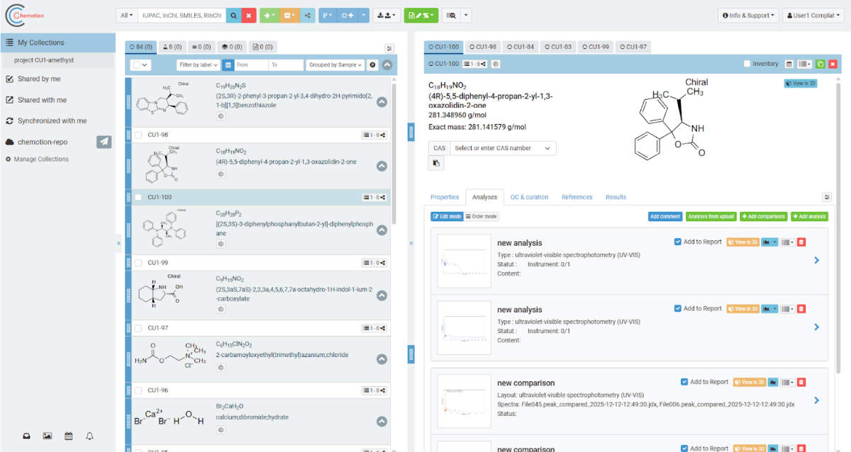 In the field of NMR data, nmrXiv and NMRium have been functionally expanded: nmrXiv offers improved security mechanisms, new integration interfaces and additional analysis modules. NMRium now supports multiple inset displays, flexible customisation and direct links between 1D and 2D spectra.