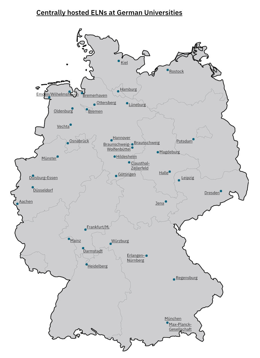 There are two special cases: Max Planck Institutes benefit from a central installation of an ELN at the Max Planck Centre. And all colleges and universities in Lower Saxony benefit from the academic cloud of the Gesellschaft für wissenschaftliche Datenverarbeitung mbH Göttingen, where an ELN is offered to all researchers from Lower Saxony.