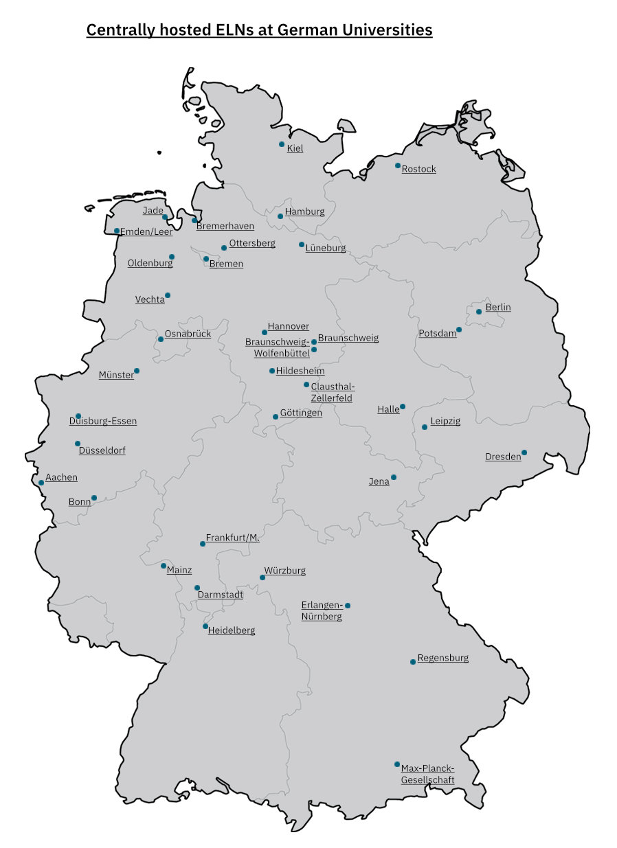 Es gibt zwei Sonderfälle: Max-Planck-Institute profitieren von einer zentralen Installation eines ELN in der Max-Planck-Zentrale. Und alle Hochschulen und Universitäten in Niedersachsen profitieren von der Academic Cloud der Gesellschaft für wissenschaftliche Datenverarbeitung mbH Göttingen, die ein ELN für alle Forscher*innen aus Niedersachsen anbieten.